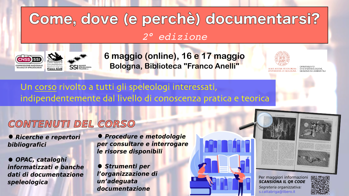 La Commissione Nazionale Scuole di Speleologia – Società Speleologica Italiana e il Comitato Esecutivo Emilia–Romagna organizza la seconda edizione del corso di 3° livello “Come, dove (e perché) documentarsi?”, in collaborazione con il Dipartimento di Scienze Biologiche Geologiche Ambientali dell’Alma Mater Studiorum Università di Bologna (Patrocinio, strutture), il CIDS “F. Anelli” (relatori, sede, struttura), il Circolo Speleologico Romano (relatori), Federazione Speleologica Regionale dell’Emilia-Romagna (patrocinio e promozione), Scuola di Bologna del GSB-USB (logistica).